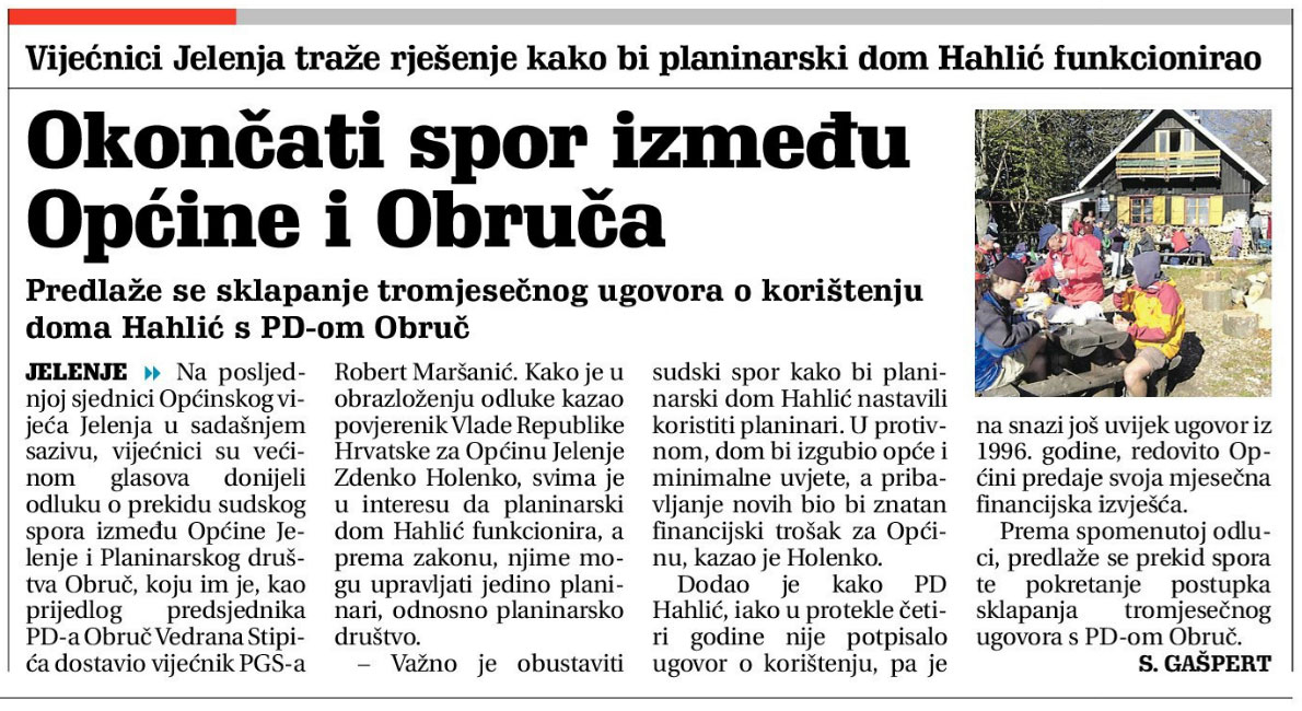 Na posljednjoj sjednici Općinskog vijeća Jelenje u sadašnjem sazivu, vijećnici su većinom glasova donijeli odluku o prekidu sudskog spora između Općine Jelenje i Planinarskog društva Obruč, koju im je, kao prijedlog predsjednika PD-a Obruč Vedrana Stipića dostavio vijećnik PGS-a Robert Maršanić. Kako je u obrazloženju odluke kazao povjerenik Vlade Republike Hrvatske za Općinu Jelenje Zdenko Holenko, svima je u interesu da planinarski dom Hahlić funkcionira, a prema zakonu, njime mogu upravljati jedino planinari, odnosno planinarsko društvo.